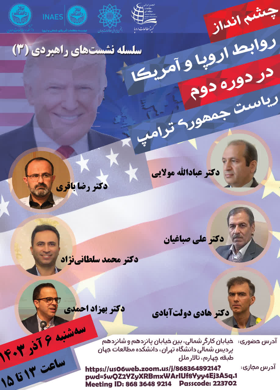 به گزارش مرکز مطالعات اروپا و آمریکای شمالی دانشکده مطالعات جهان دانشگاه تهران، نشست سوم از سلسله نشست های راهبردی با عنوان «چشم انداز روابط اروپا و آمریکا در دوره دوم ریاست جمهوری دونالد ترامپ ،روز سه شنبه مورخ ۶ آذر ماه با همکاری انجمن ایرانی مطالعات منطقه ای در تالار ملل دانشکده مطالعات جهان؛ به بررسی روابط اتحادیه اروپا، بریتانیا، فرانسه و آلمان با ایالات متحده آمریکا در دوره دوم ریاست جمهوری دونالد ترامپ شد.